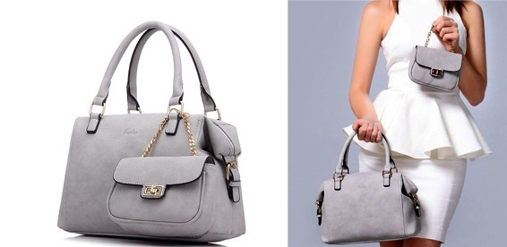Женская сумка из мягкой искусственной кожи плюс съемная вечерняя сумочка на цепочке. Закрывается на молнию, имеет внутренние карманы. Размеры большой сумки: длина - 29 см, ширина - 12,5 см, высота - 18 см. Размеры маленькой сумочки: длина - 15 см, ширина - 4,5 см, высота - 11 см. Производство - Китай.