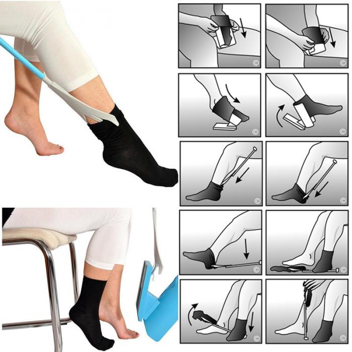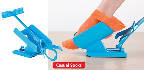 Люди, страдающие ожирением, острыми болями в пояснице и различными видами нарушений опорно-двигательного аппарата, получили прекрасную возможность обходиться без посторонней помощи при надевании и снимании носков. Для этого инженеры британской компании Sock Aid разработали приспособление Easy On Easy Off Sock Aid Kit, которое состоит из двух частей, одна из которых имеет форму наклонного U-образного полуцилиндра, называется Easy On и предназначена для надевания носков, а другая, Easy Off Sock Aid, помогает их снять, практически не нагибаясь.