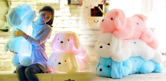 Мягкая, большая чудесная собачка ( 50 см.) подарит вашему ребенку много радости! Нажав на лапку, вы включите подсветку, и ваша собачка засияет. Цвет подсветки можно переключать ( до 8 цветов).