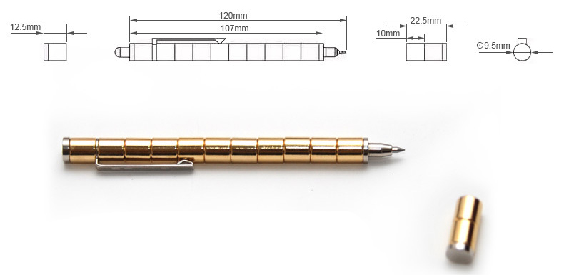 Ручка полностью разбирается и состоит из 13 магнитов. Вместо двух замыкающих шайб, можно использовать два стилуса, реагирующих на прикосновения iPhone/iPad. В комплекте есть стержень и наконечник для стержня.