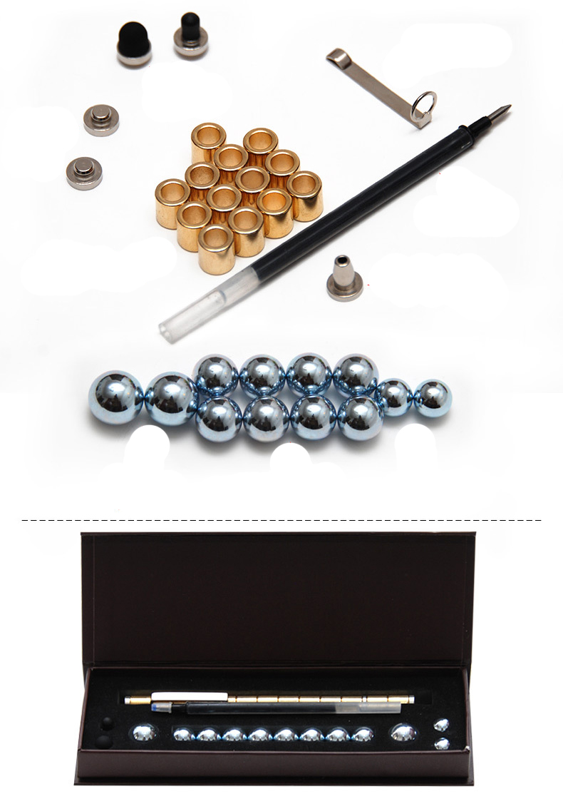 12 цилиндрических магнитов - два маленьких, два больших и восемь средних металлических шариков; пара заглушек, пара насадок стилус, зажим, направляющая и стержень. Ручку можно собрать разными способами, со стилусом и без.