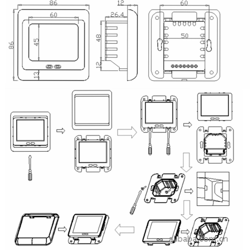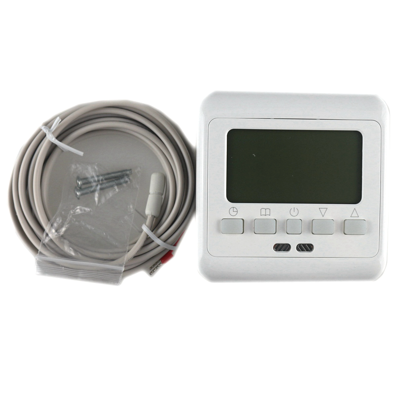 Комнатный программируемый терморегулятор со встроенным датчиком температуры воздуха и выносным датчиком температуры пола. Большой графический дисплей с подсветкой и кнопками управления. Наличие встроенного меню. Встроенный монтаж. Многорежимный терморегулятор : постоянное поддержание комфортной температуры, суточный цикл, недельный цикл. Датчик пола входит в комплект. 16 А.