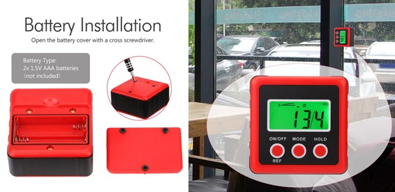 Цифровой угломер позволяет быстро и точно определить угол отклонения поверхности от горизонта или вертикали. Достаточно установить прибор на поверхность или прикрепить, к вертикальной конструкции и он покажет на дисплее не только угол отклонения, но и его «направление». Для измерения относительных углов (между двумя произвольно выбранными поверхностями) есть специальный режим. Корпус прибора выполнен из лёгкого и прочного алюминиевого сплава, рабочая поверхность оснащена магнитами, что позволяет легко крепить и определять уклон стальных конструкций. Благодаря малому весу и размерам он не займет много места. Применение: выравнивание торцовочных пил, направляющих для ГКЛ и подвесных потолков, столярных работах и т.д.