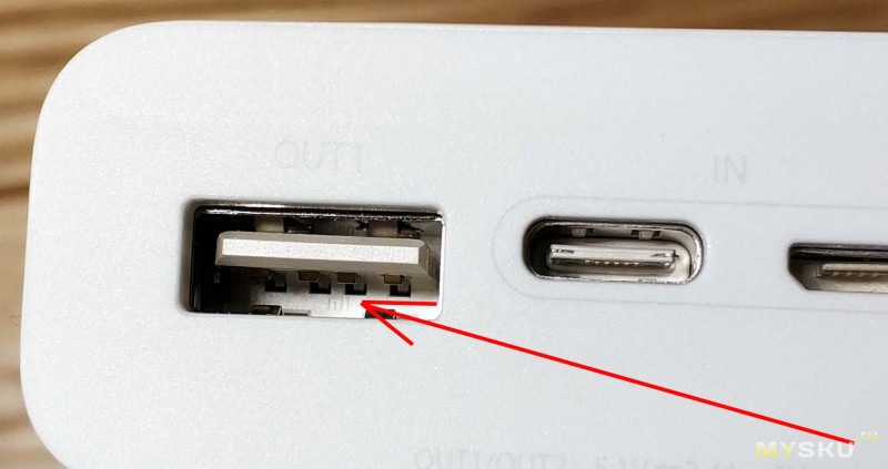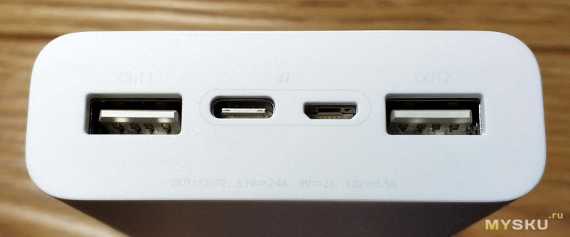 Интерфейсы, как и в прошлых моделях ZMIXiaomi размещены на верхнем торце устройства. Тут мы видим два обычных выхода USB, подписанных как «OUT1», «OUT2» и между ними, два входа. Один вход это microUSB, а второй — одно из нововведений порт Type-c. Оба подписаны как «IN» (т.е. вход). Чуть ниже можно разглядеть подсказку от производителя, которая говорит нам о том, что оба выхода равнозначны по своим техническим возможностям.
