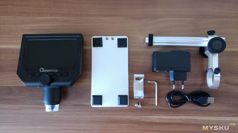 Спереди у микроскопа находится 4.3 дюймовый цветной экран, на который выводится изображение изучаемого предмета и меню управления микроскопом. Микроскоп может работать и управляться автономно — от встроенного аккумулятора и с использованием карты памяти микроSD. Второй вариант управления и работы — через компьютер.