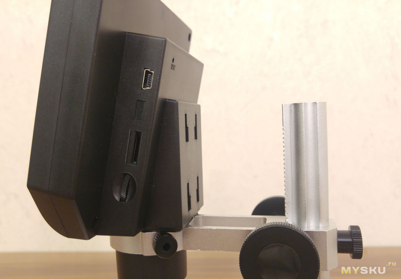 Для подключения используется боковое миниUSB гнездо. Микроскоп при этом нужно включить до или после подсоединения к компьютеру, при этом экран устройства блокируется, на нём появляется крупная надпись USB и тут мы уже всё управление осуществляем из компьютерно приложения.