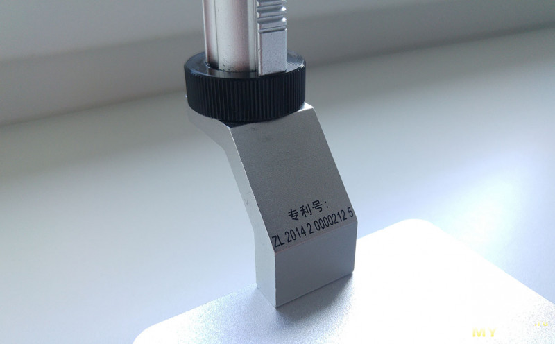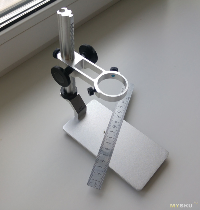 Сделан просто отлично, везде где можно и нужно металл (в основном алюминий). А на винтах, удерживающих микроскоп, наоборот пластиковые вставки. Люфтов практически нет, высота регулируется, механизм удержания от самопроизвольного опускания тоже регулируемый и сделан просто и надёжно. При изменении высоты не надо ничего фиксировать и снимать с фиксации. Один раз настраиваете усилие удержания и дальше просто крутите винты изменения высоты. Их кстати два — и под левую и под правую руку. Штатив вполне устойчив, несмотря на свою компактность.