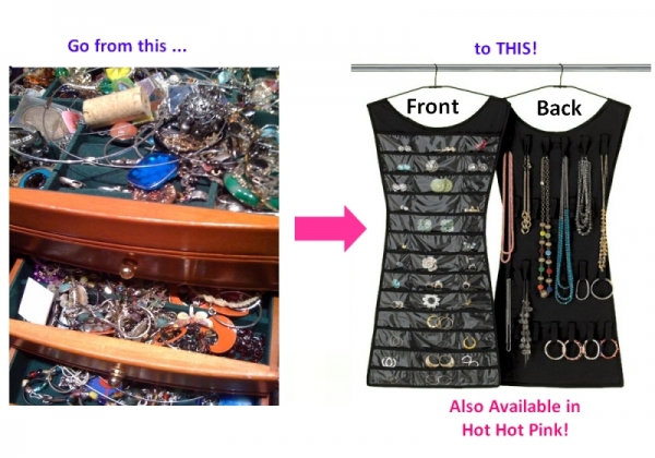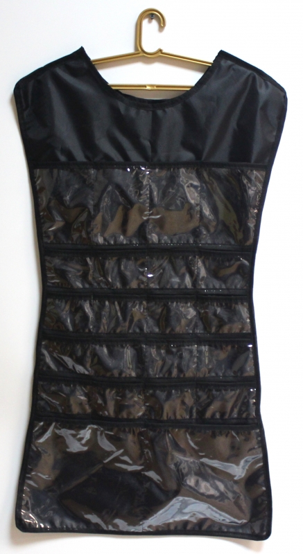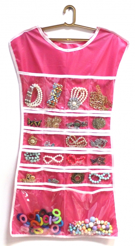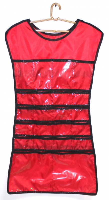 Каждая леди должна иметь столь уникальную вещь у себя дома. Изысканное изделие в виде черного или розового платья – это стильный способ разместить всю коллекцию своих украшений так, чтобы не приходилось тратить уйму времени на поиски нужных вещиц. Двухстороннее Платье-органайзер позволяет вместить огромное количество украшений и бижутерии. На одной стороне расположены 30 прозрачных кармашков, в которых можно хранить серьги, браслеты, кольца и т.д. Оборотная сторона предназначена для хранения бус, цепочек, шарфиков и ремешков.