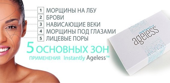 Крем от морщин Instantly Ageless является эксклюзивным косметическим продуктом, эффективно устраняющим главные косметические дефекты. Крем борется с мешками под глазами, устраняет отечность век, качественно разглаживает кожу, покрытую морщинами. Также с помощью крема удается сузить расширенные поры и убрать морщины в зоне лба без какого-либо нарушения подвижности мимики.