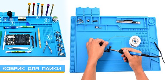Большой коврик для пайки, работ с мелкими деталями, сборки и ремонта гаджетов. Размеры коврика 480*318 мм. Имеется множество отсеков, отделов, углублений для всякой мелочевки. Для крепежа и инструментов есть вмонтированные магниты. Модель новая и сюда добавили специальные места для крепления плат шириной 18 и 20 мм. Толщина коврика в самой высокой части 5 мм и выдерживает он температуру в 500 градусов.