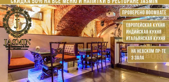 Купон дает право скидки 50% на все меню и напитки, в том числе с градусом, паровые коктейли в ресторане Jasmin.Как работает купон: |