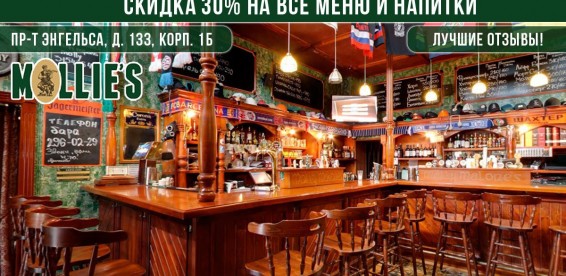 Купон дает право скидки 30% на все меню кухни и безалкогольные и крепкие напитки, а также пенное пинтами в пабе Molly Malone.