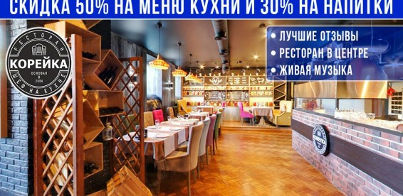 Купон дает право скидки 50% на все меню кухни и 30% на все напитки в ресторане «Корейка».Дополнительные условия:— креативная подача блюд; — уютный интерьер; — новый ресторан в центре города; — живая музыка каждую пятницу и субботу; — ароматный дым; — празднование любых мероприятий под закрытие, есть зоны на выбор. Как работает купон: |