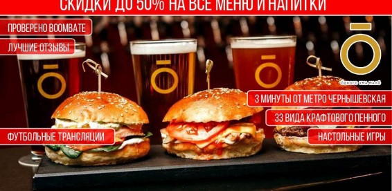 Купон дает право скидки 50% на меню и 30% на напитки и пенное в баре «Одного ума мало».