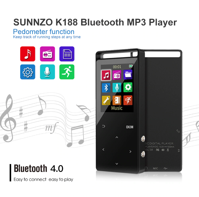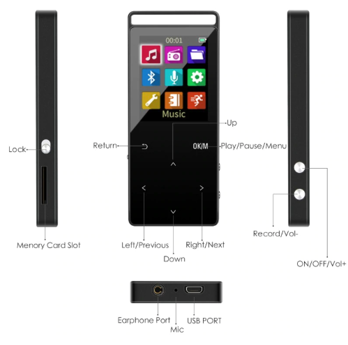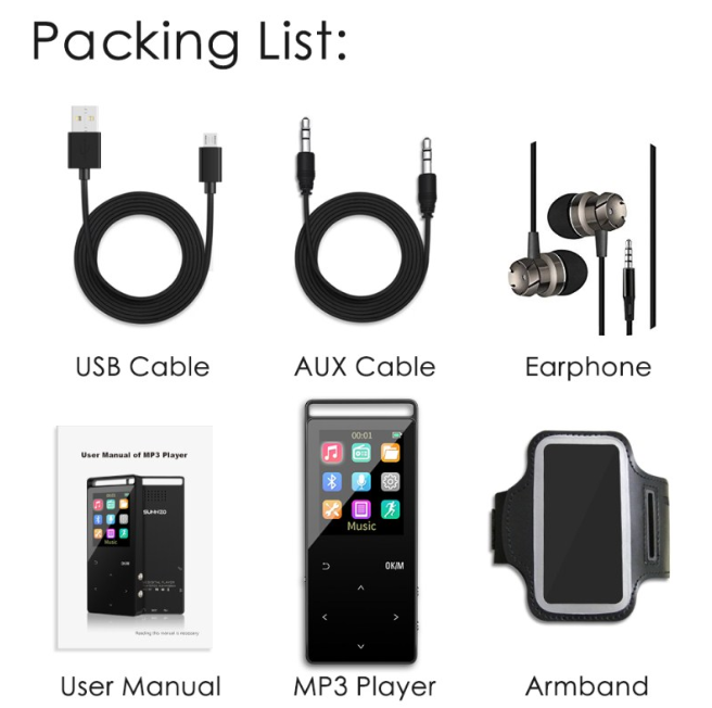 Посылка содержание:1 x MP3, 1 х Наушники, 1x3,5 мм аудио кабель, 1 х Английский Руководство, 1 х USB кабель для передачи данных, 1 х рука ремешок
