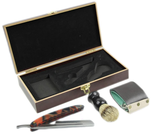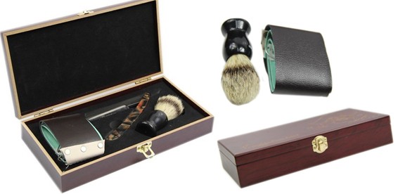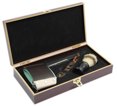 В набор входят: футляр, кожанный ремень для заточки, бритва, помазок.