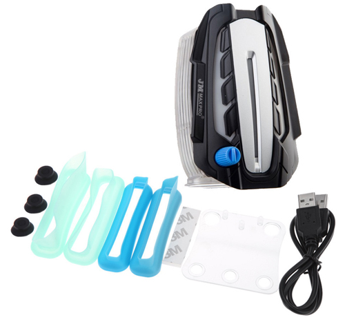 В комплекте: кулер, USB - кабель, резиночки для разных типов воздухоотводов, присоски для крепления.