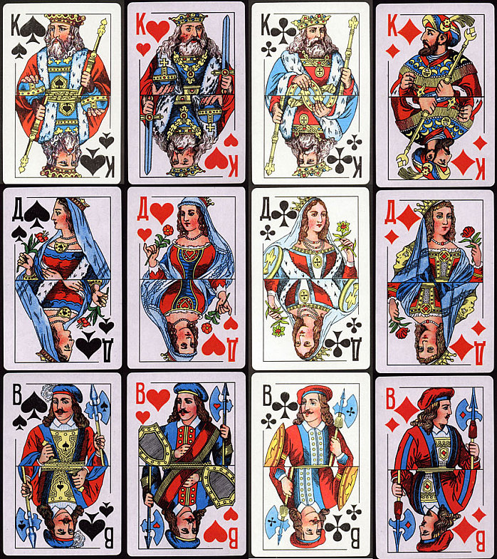 В комплект входит 10 колод по 54 карты. Рисунок - "Атласные".