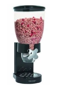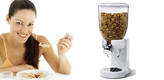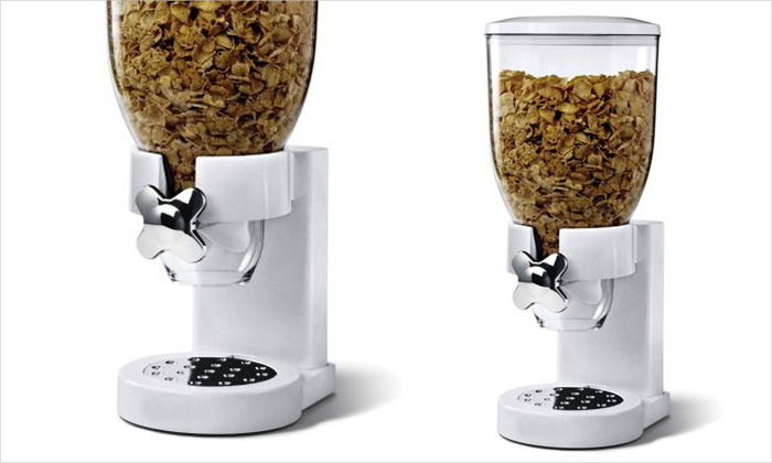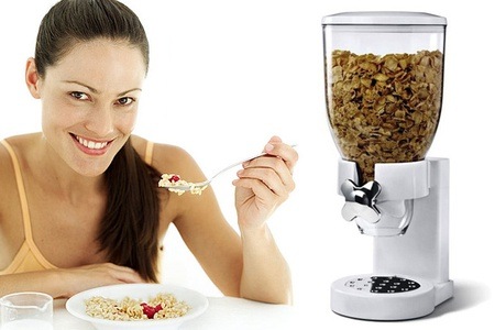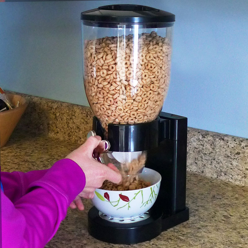 Автоматический дозатор сухих завтраков. Один поворот ручки — и порция завтрака в Вашей миске. Ничего не просыпется мимо, не надо хранить в шкафу штабеля картонных коробок, к тому же Вы всегда увидите, когда Ваши мюсли соберутся заканчиваться и сможете пополнить запас.