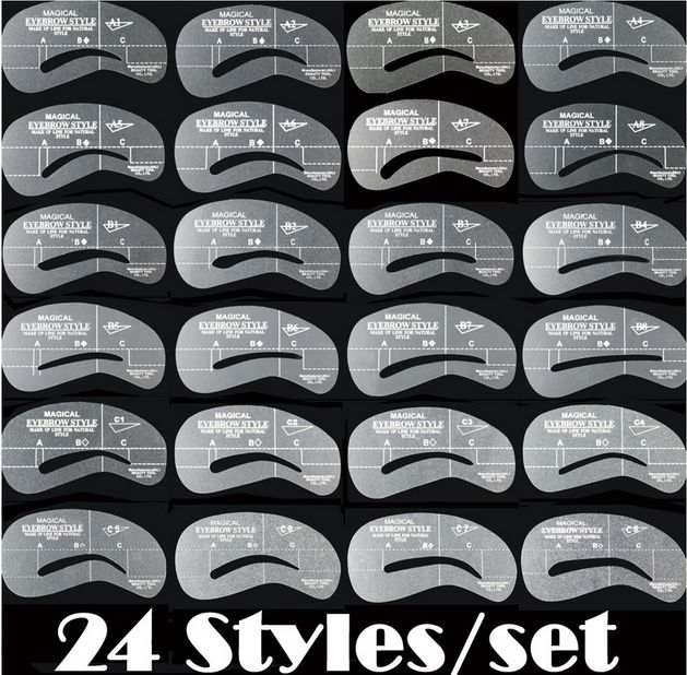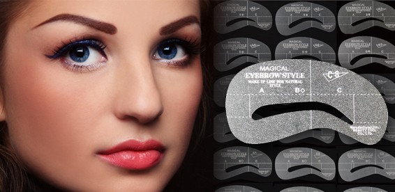 Трафареты для бровей (на фото выше) – это карточки или маски, изготовленные из разных материалов. Они имеют прорези, полностью повторяющие форму бровей. Эти карточки прикладываются к лицу таким образом, чтобы прорезь «ложилась» на бровь. Так, можно корректировать их форму и наносить макияж.