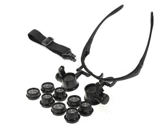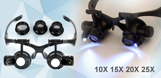 Бинокулярная лупа в металлическом каркасе с носоупорами. Увеличение: 10x/15x/20x/25x. 3 комплекта сменных бинокулярных линз для каждого глаза в комплекте могут быть легко установлены для нужного увеличения.Светодиодная подсветка позволяет работать в условиях недостаточной освещенности. Лупа позволяет не занимать руки и рассматривать предметы при большом увеличении.