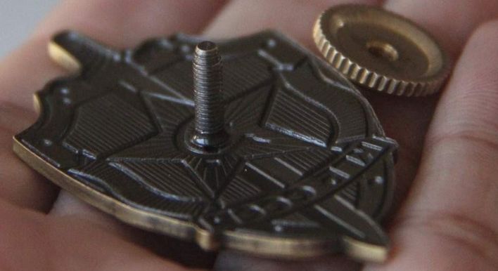 Использование в производстве подобного высокопрочного материала делает значок стойким к механическим повреждениям. На одежде знак фиксируется винтом, который крепко спаян с его основанием.