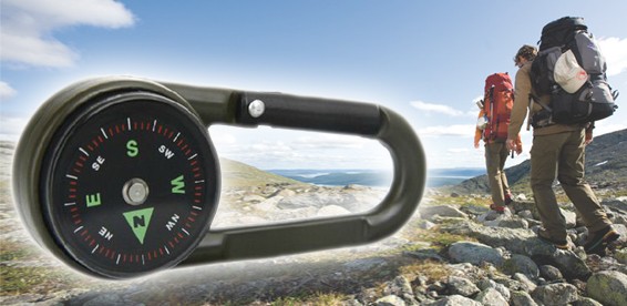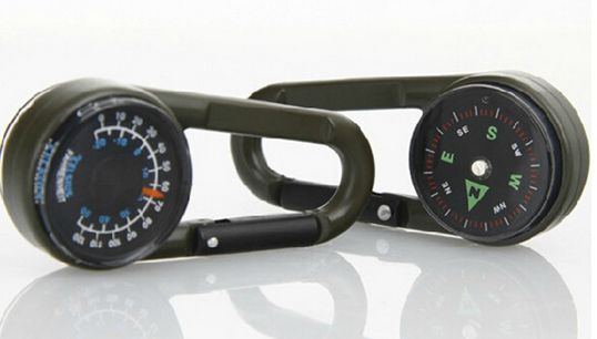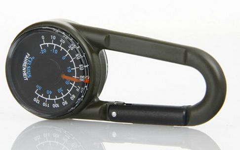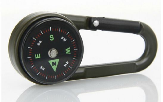 Карабин с компасом и термометров. Вешается на пояс, на сумку, лямки рюкзака или разгрузку - одним словом, куда угодно (где есть за что зацепиться карабином). Простой и удобный способ определить направление движения и температуру, оставив руки свободными. С ним вы всегда найдете дорогу и узнаете, сколько сейчас градусов ! Циферблат компаса фосфорецирует в темноте: зарядите его на свету днем и он будет подсвечиваться в темноте ночью !