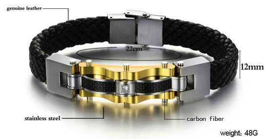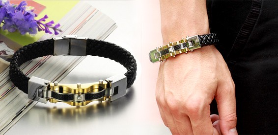 Мужской браслет из нержавеющей стали на плетёном кожаном ремешке.