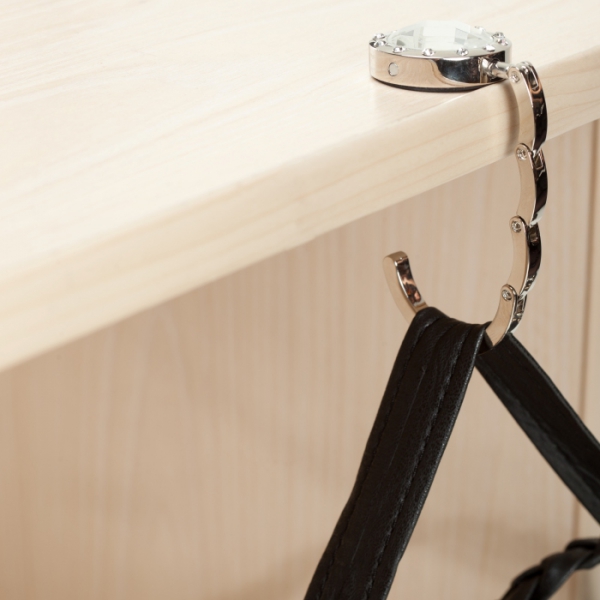 Декоративную часть кладем на столешницу, а на раскладываемый металлический крючок вешаем сумку или любой другой предмет (например, зонтик). Не скользит, не сдвигается, не царапает поверхность стола — под декоративной частью находится специальная защитная прослойка.