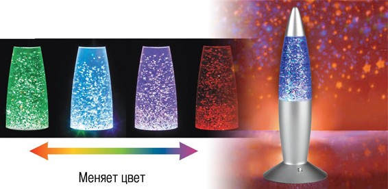 Эта волшебная лампа – прекрасный источник хорошего настроения! Наблюдать за кружением блесток можно бесконечно, наслаждаясь игрой света и гармонией движения.