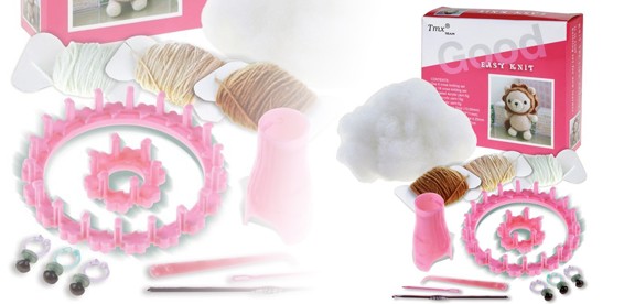 В комплекте: 1 круглый станок диаметром 12 см; 1 малый круглый станок диаметром 5 см; 1 крючок; 1 завершающая игла; пряжа трех цветов (белая, бежевая, светло-коричневая); фурнитура для оформления; волокнистый наполнитель игрушки.