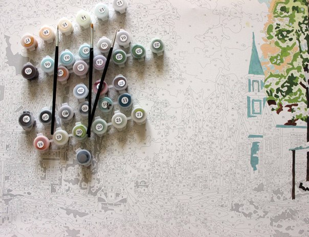 Для создания картины нужно лишь наносить цвета из баночек с краской, которые соответствуют цветам на холсте.
