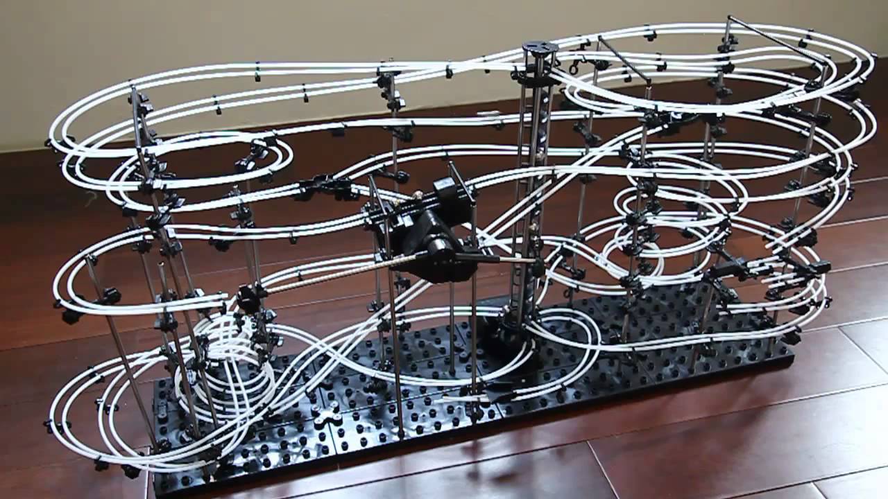 Конструктор SpaceRail представляет собой основание, алюминиевые стойки, держатели направляющих, стрелки-разветвители, вертикальный подъёмник, напоминающий винт Архимеда, и направляющие - белые полиэтиленовые трубки.