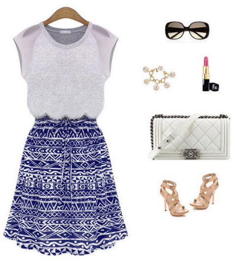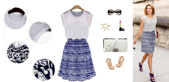 Повседневное летнее платье длиной до колена с О-образным вырезом и короткими рукавами. Удобное, свободного покроя. Украшено печатью и тесьмой.