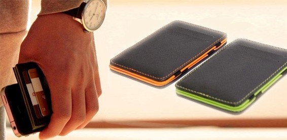 Это революционный двухсторонний держатель (портмоне, кошелёк) для купюр и банковских карт. Он имеет небольшую толщину и размеры, но позволяет хранить большое количество денежных купюр и банковских карт.
