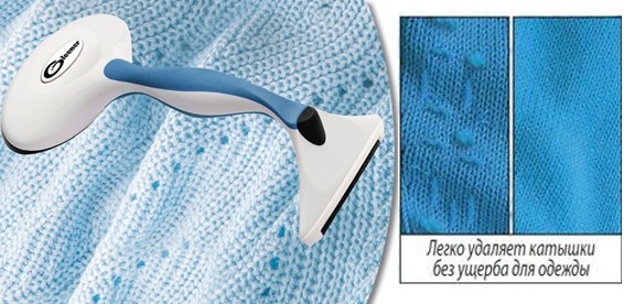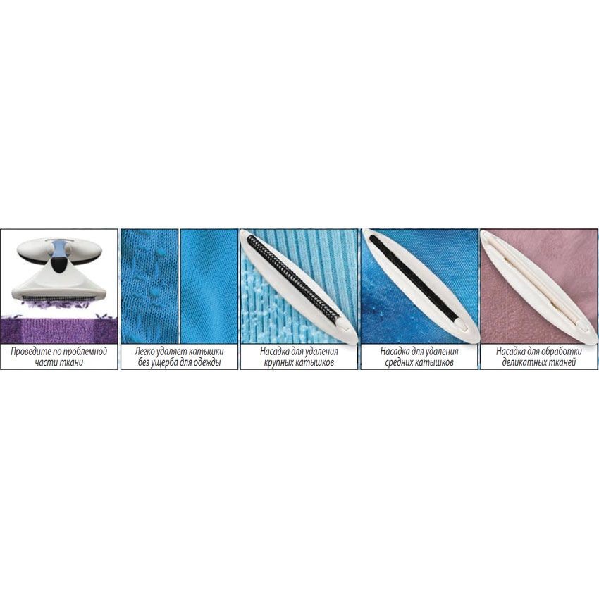 В комплект входит насадка для снятия пуха, а также 3 насадки для обработки разных тканей, в том числе самых деликатных.