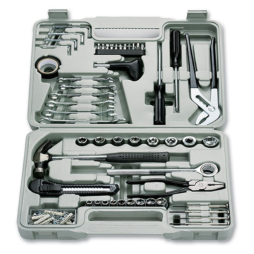 В комплекте: 1 пластиковый ящик, 1 изолента, 1 пассатижи, 1 плоскогубцы шарнирные, 1 молоток, 1 нож, 4 отвертки, 2 отвертки 6х100, 1 рукоятка, 11 бит, 1 адаптер для бит, 6 комбинированных ключей: 8, 10, 1, 12, 13, 14 мм, 1 – 3/8 рукоятка, 9 – 1/4 торцевых головки: 10, 11, 12, 13, 14, 15, 16, 17 мм, 4 ключа НЕХ: 3, 4, 5, 6 мм, 90 крепежей: 75 гвоздей, 10 шурупов, 5 закрепителей проволоки, 8 – 3/8 торцевых головки: 10, 11, 12, 13, 14, 15, 16, 17 мм.