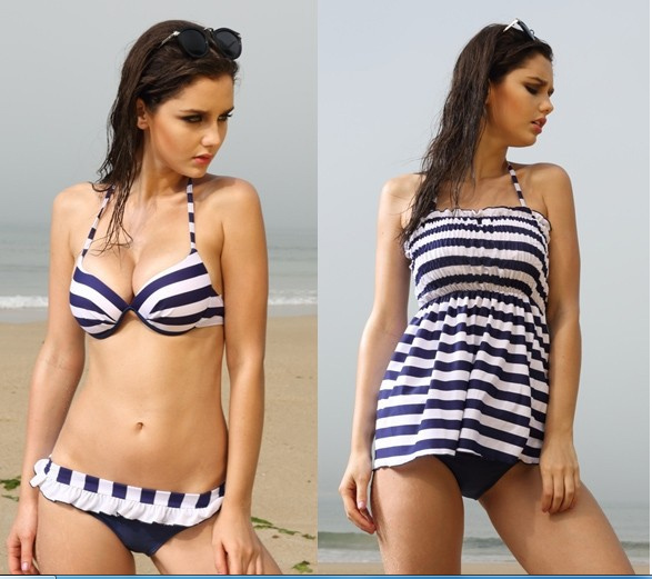 Этот стильный купальник прекрасно смотрится практически на любой фигуре. Кроме того, в комплекте идёт симпатичный сарафан, который удобно надеть, уходя с пляжа, а также в нём можно просто гулять.