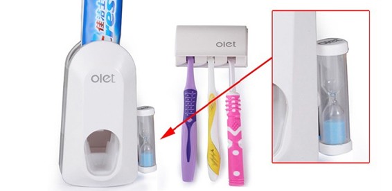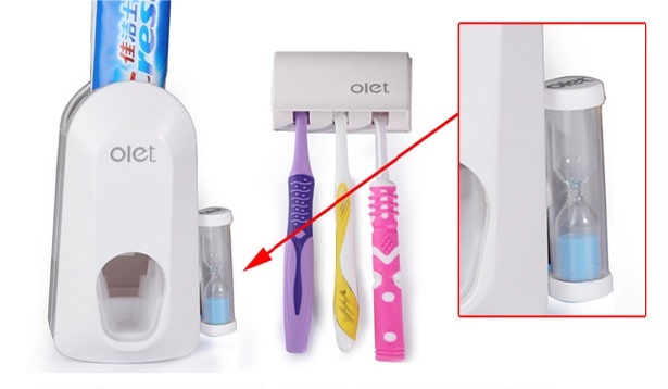 - зубная щетка с дозатором пасты расположены рядом, Вы не тратите время на поиски;