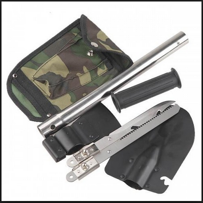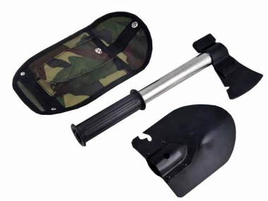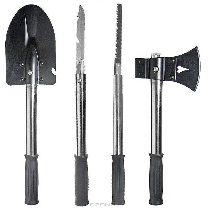 Имеет 4 съемных инструмента: лопатку, топорик, пилку и нож. Рукоятка сделана из металла с обрезиненным покрытием и не подвергается коррозии. Штык лопаты снабжен открывалкой для бутылок и банок. Все насадки выполнены из прочной стали.