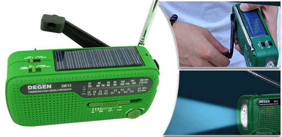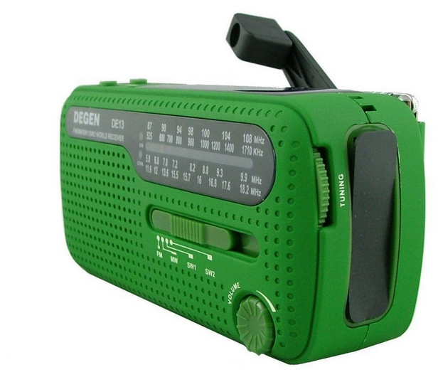 Degen DE-13 это универсальный походный динамо радиоприёмник, идеальный для туристов. Помимо основной функции – приёма радиосигнала в нескольких диапазонах, устройство позволяет подзаряжать портативную электронику через USB-выход. Кроме того, оснащён встроенным фонарём двух цветов (постоянный белый свет либо мигающий красный), а также громкой сиреной. Устройство предусматривает три варианта питания и три варианта подзарядки собственных аккумуляторов: от динамо-машины, солнечных батарей или через mini-USB-порт.