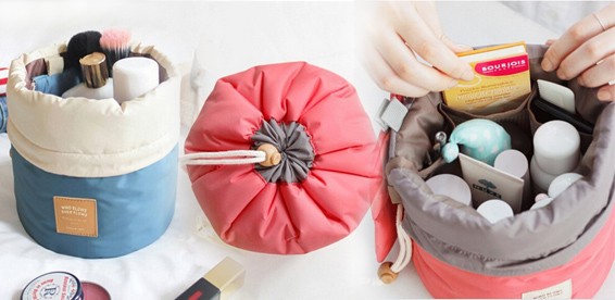 Необычная бочкообразная косметичка стягивается шнурком и превращается в аккуратный мешочек. Внутри есть отделения и достаточно места, чтобы взять с собой в путешествие всю необходимую косметику.