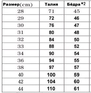 Модели брюк с 1 по 9 доступны в размерах: 28, 29, 30, 31, 32, 33, 34, 36, 38, 40, 42, 44