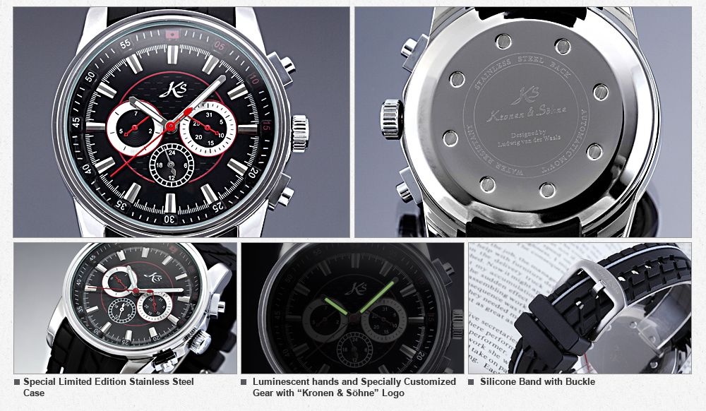 В часах используется прорывная запатентованная немецкая технология точного хода "Kronen&Söhne", а также уникальная система "Tire Veins", позволяющая регулировать ремешок для удобного ношения.