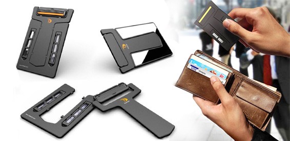 Вы можете положить Carzor в свой кошелёк, просто сложив вместе зеркало и станок, так чтобы они имели форму кредитки.