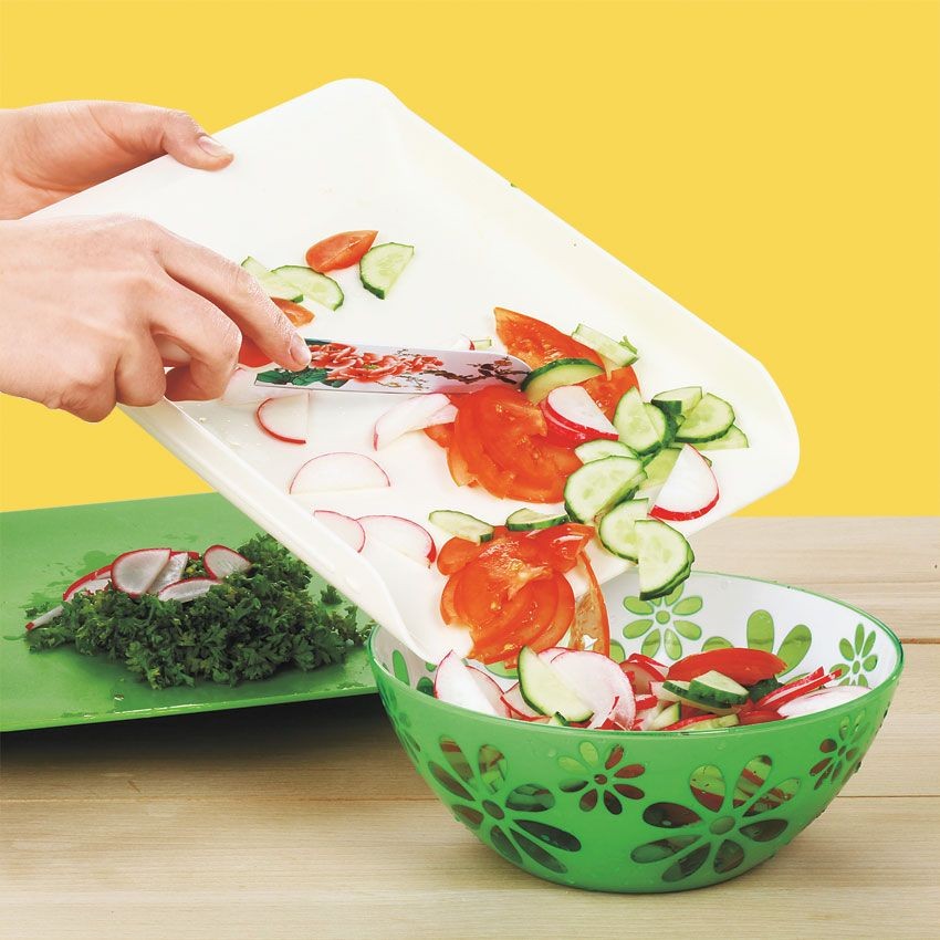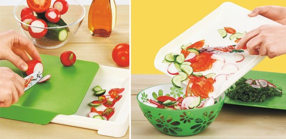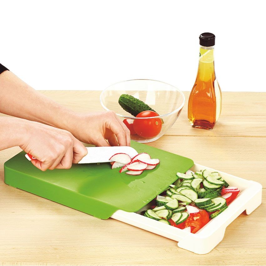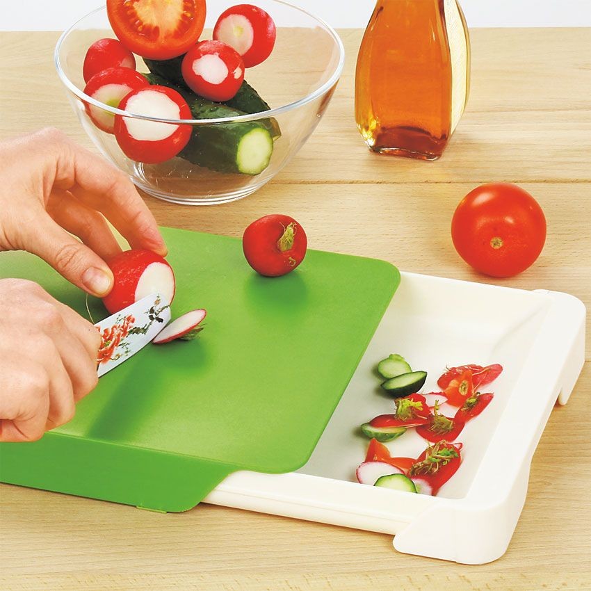 Овощи не просыпятся мимо, если их резать на доске с контейнером. Конструкция позволяет собирать все ингредиенты для блюда сразу в одну емкость. Вы также можете использовать этот контейнер, наоборот, для отходов.