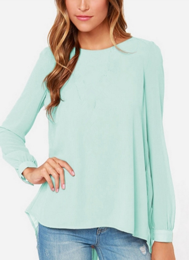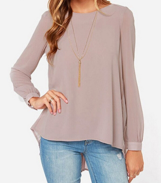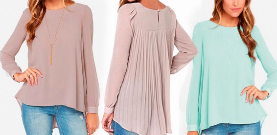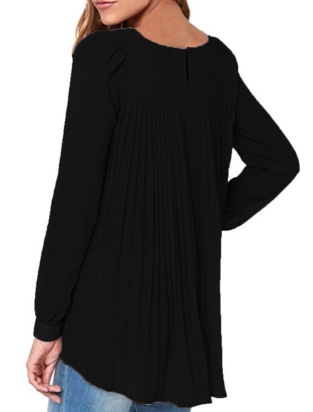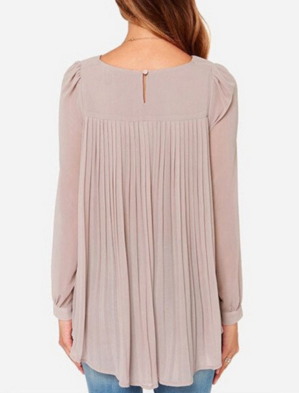 Летящая шифоновая блуза расклешёного силуэта на каждый день. На спинке блузы оригинальная деталь - плиссированная вставка и застёжка на петлю и пуговицу.