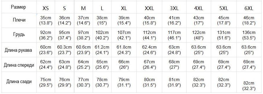 Размер: XS, S, M, L, XL, XXL, XXXL, 4XL, 5XL, 6XL