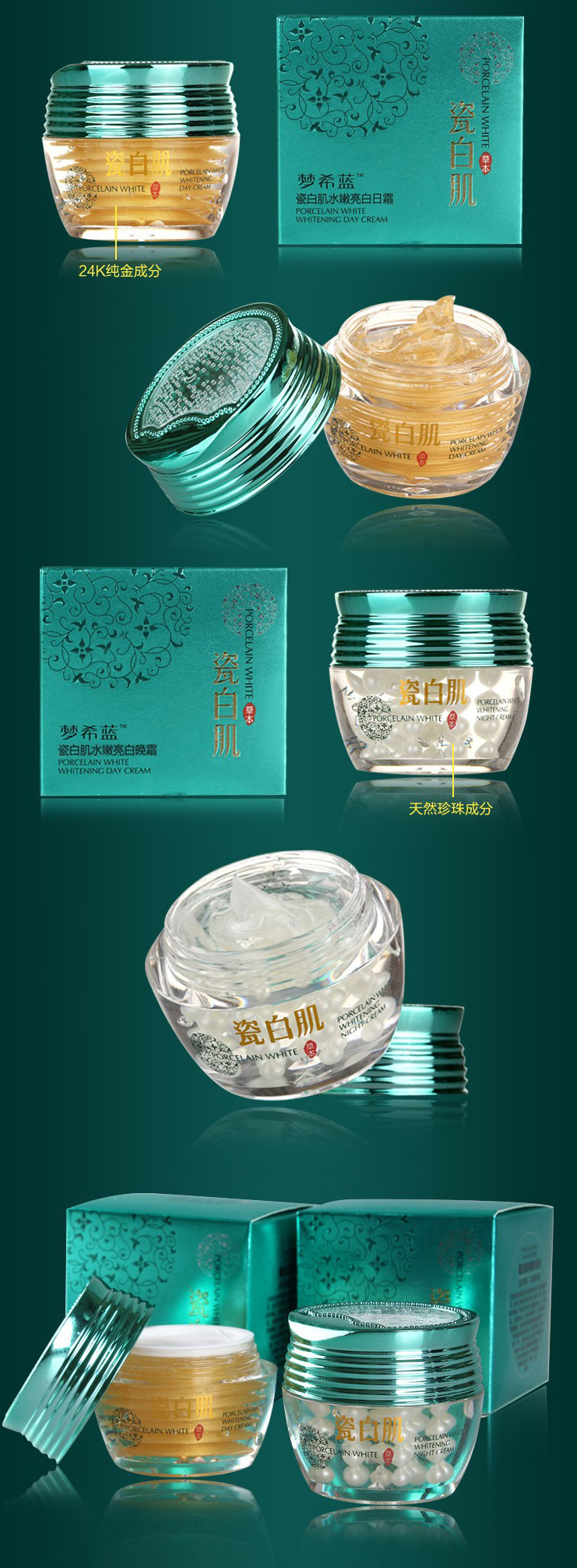Дневной крем с золотом (24 К) защищает кожу от солнца днём, ночной крем с экстрактом жемчуга восстанавливает её ночью. Результатом их комплексного действия становится сияющая белизна кожи, омоложение и увлажнение. Также предотвращают появление акне.