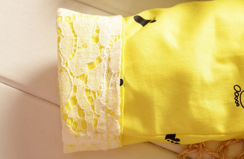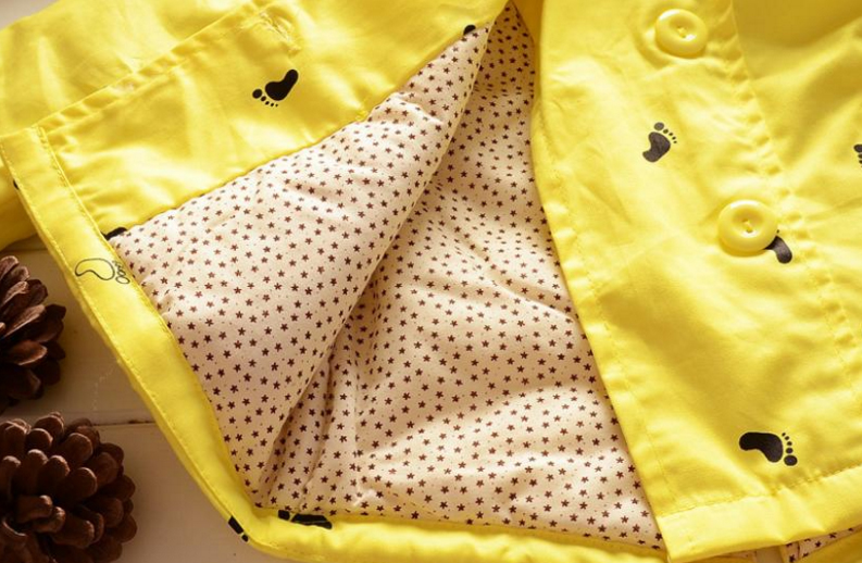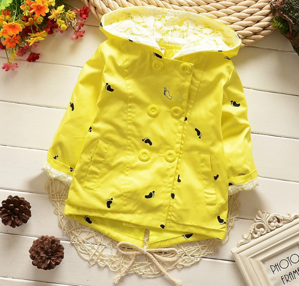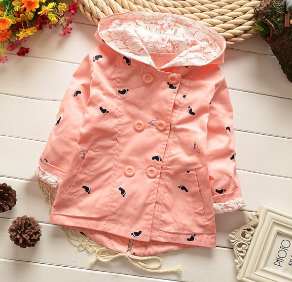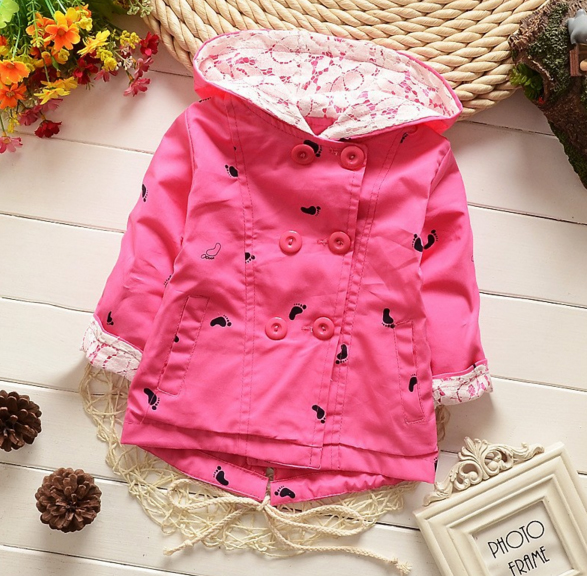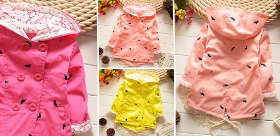 Яркая курточка для девочки на прохладную погоду. Манжеты и капюшон куртки украшены вставками из кружева, на спинке - разрез, декорированный шнуром.